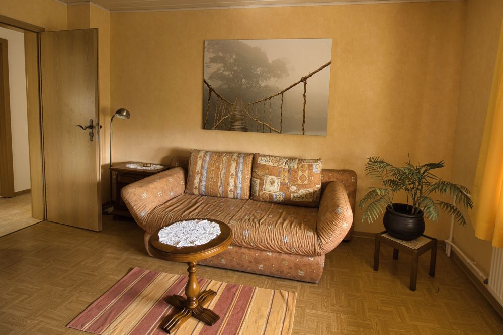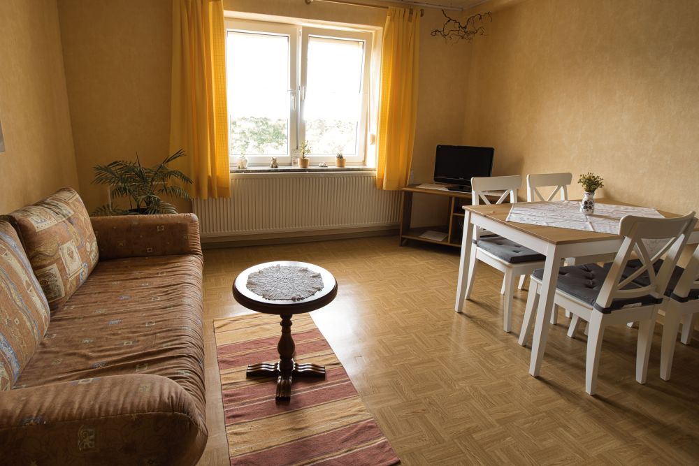 Der Wohnbereich ist ausgestattet mit einer Doppelschlafcouch, einem Couchtisch, einem kleinen Schränkchen und Fernseher.